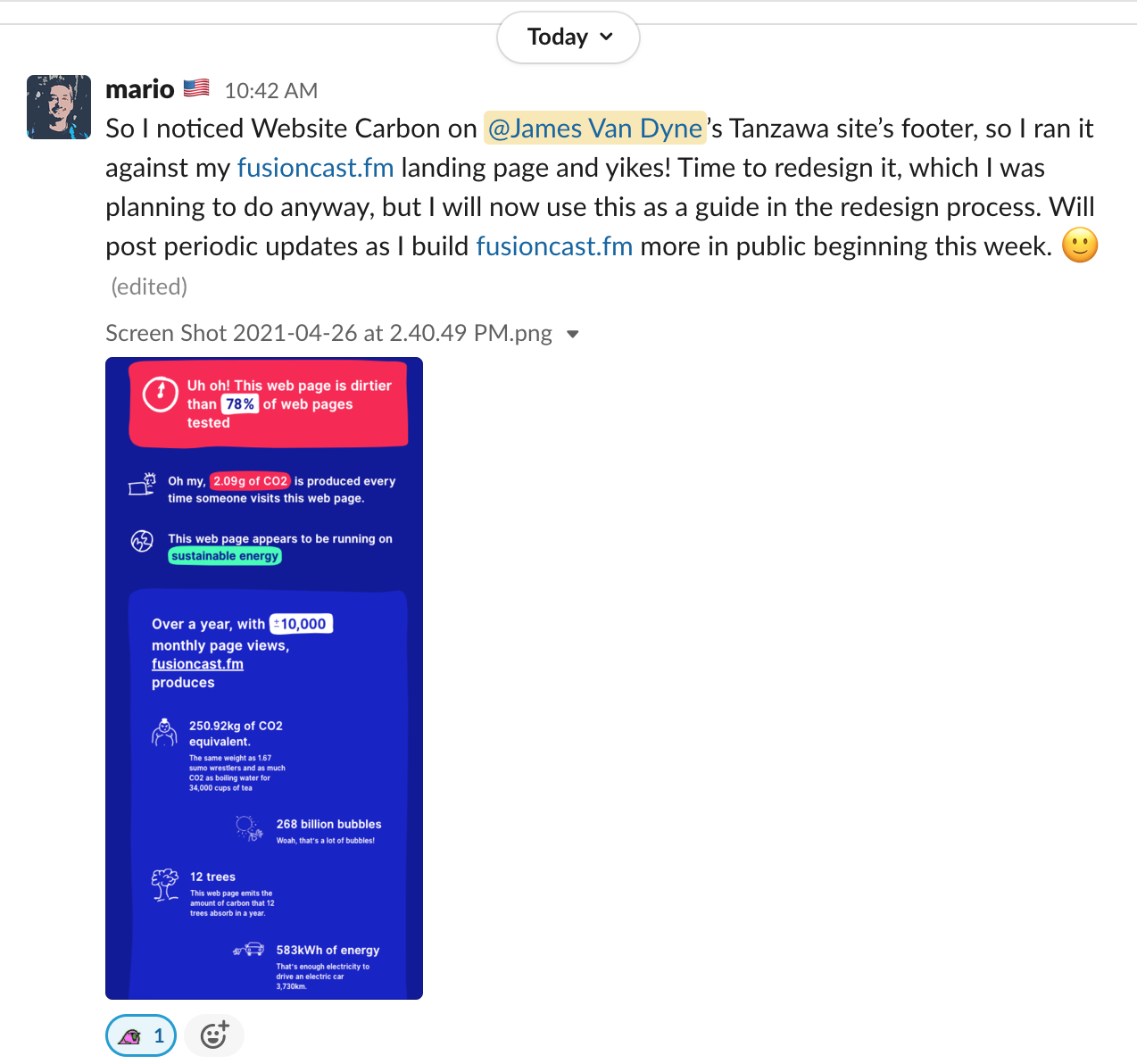 This is the first documented instance I have of people being inspired to reduce the carbon impact of their sites based on my work! One site down, a million left :) -