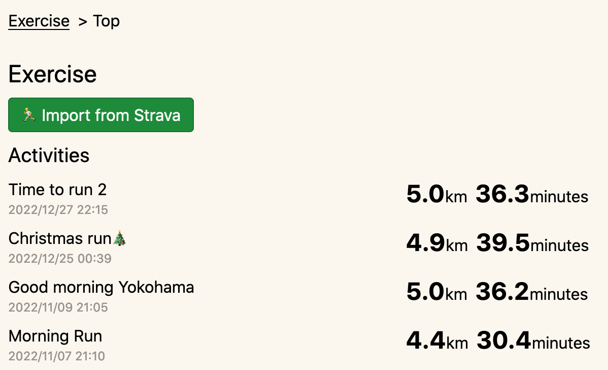 Just in time for the new years resolutions (and the last possible moment for me to hit one of my own 2022 goals), Tanzawa integrates with Strava via a new Exercise plugin. This initial release is the absolute minimal viable integration.