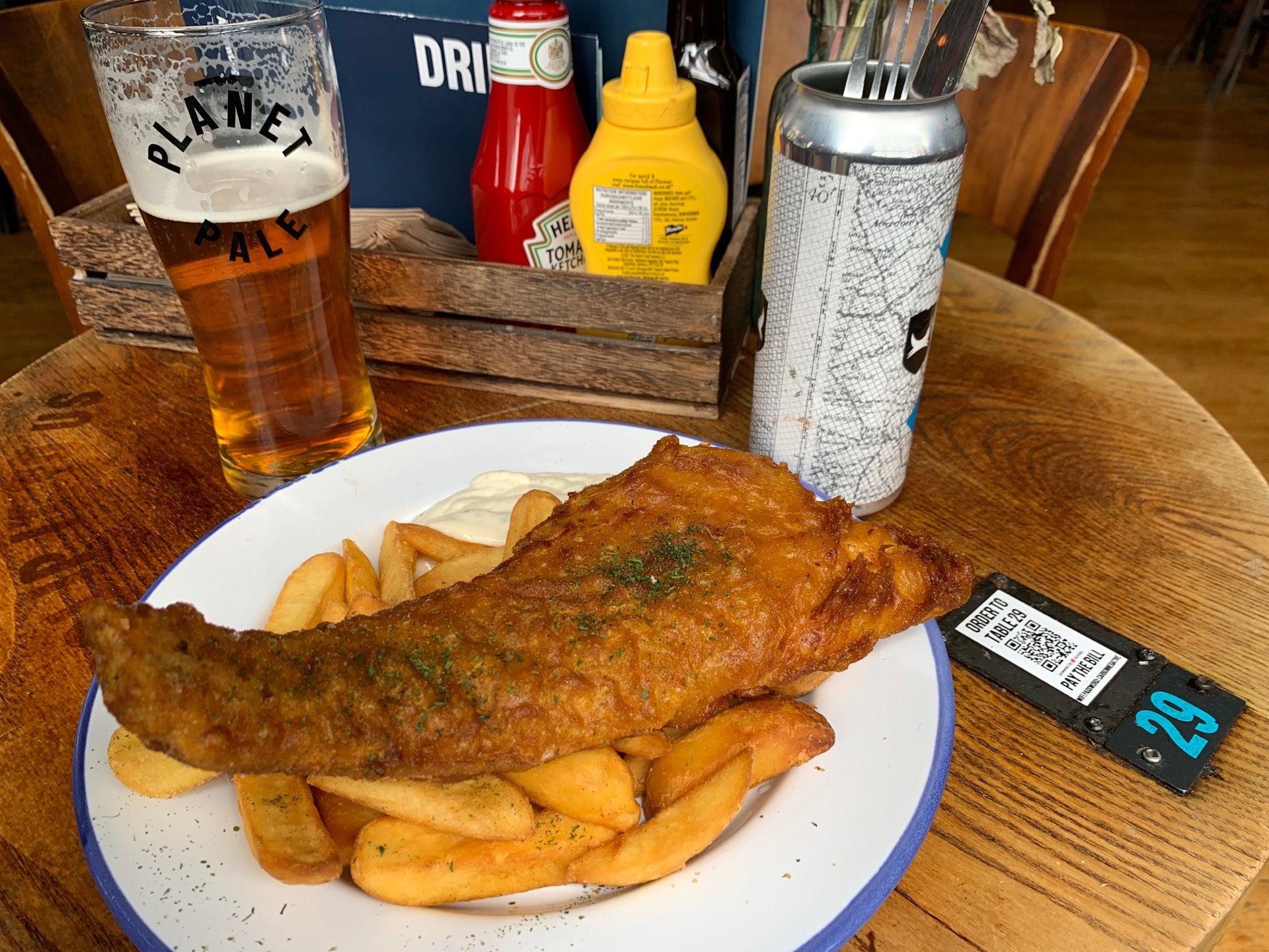 Refueling with Elvis Juice and fish & chips.Fish & chips -