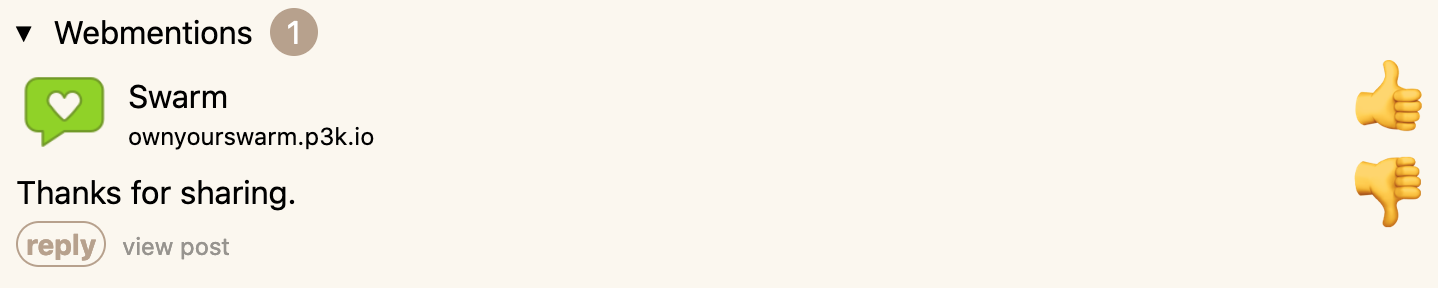 byI shipped some nice quality of life improvements around webmentions with Tanzawa. There were a few issues with the design that didn't become apparent until I'd used it for a while, especially with older posts.