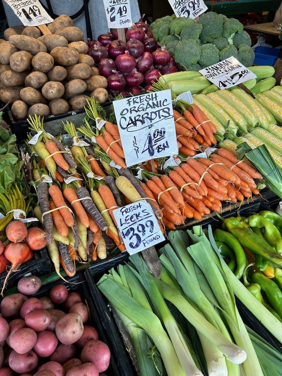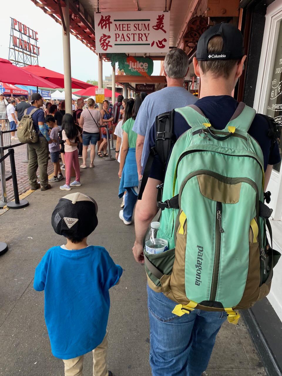 πͺ On our way to the airport we dropped by Pike Place market for a couple of hours. I could spend all morning there β all of the vendors and the food look so good. As we got there around noon, it was packed. The line to the original Starbucks was probably an hour long (despite the menu being the exact same). Carrots in multiple colors π Finding gyros is a challenge in my part of Yokohama, so I opted to get a lamb gyro for lunch. It did not disappoint, except for at the very end where it started leaking on to my jeans. π Walking with Leo in the market Next time I visit Pike Place, I want to go early when the vendors are just getting setup and there's less traffic.