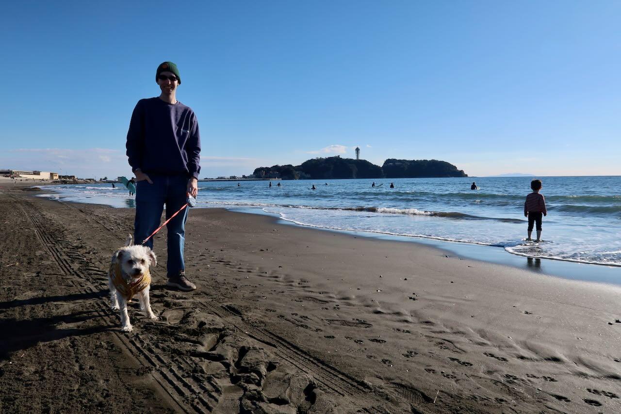 We often make a trip to the beach during Christmas / New Years. Not to go swimming, but just to enjoy the clear air and less crowds. This year we went on Christmas day. It's been a couple of years since we brought Sophie with us on these...and she was excited to come along and run around in the sand, dig, and get some sniffs in.Me holding Sophie and Leo splashing in the water