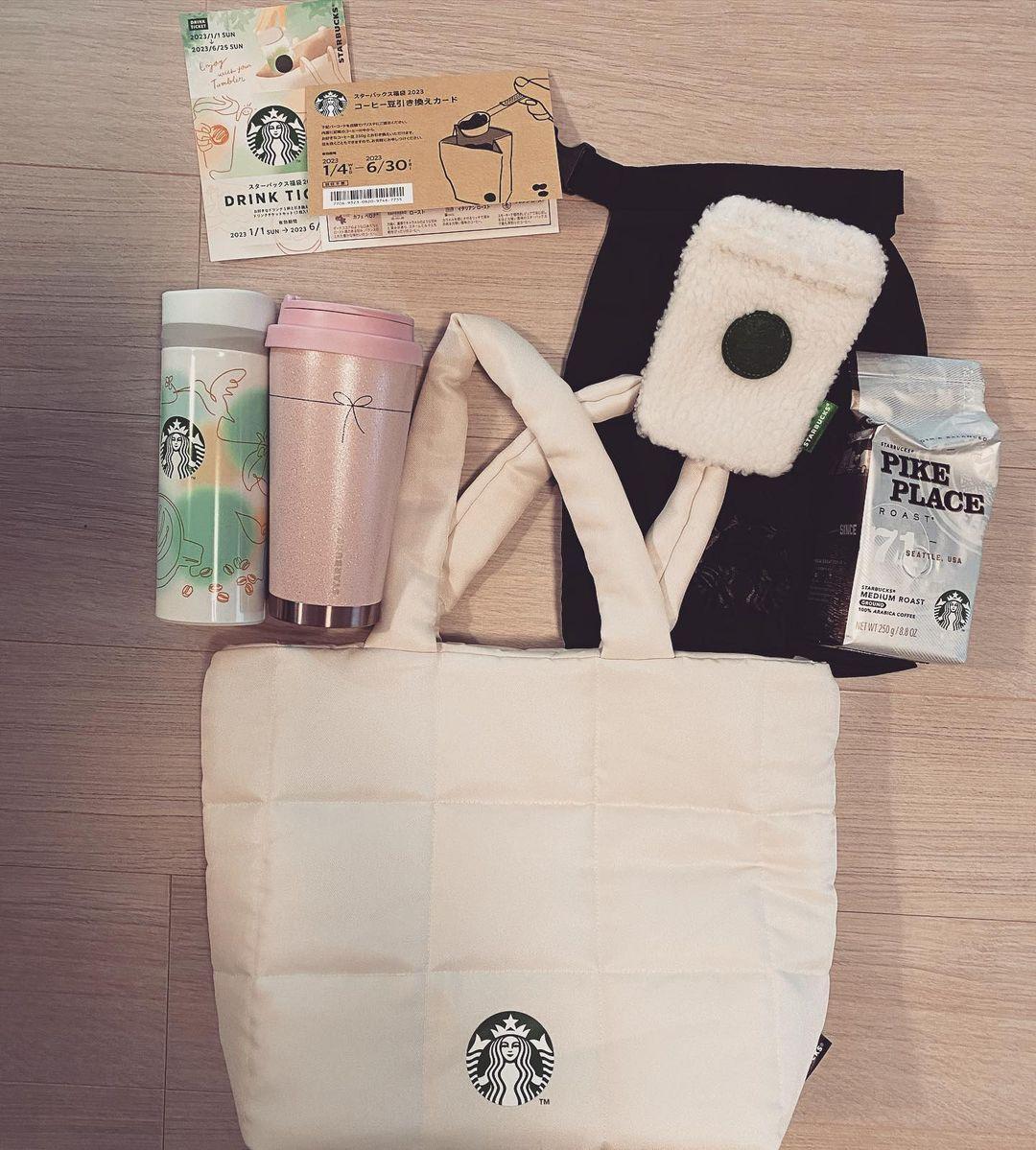 - We were one of the lucky ones and scored a Starbucks Fukubukuro, or "lucky bag". A lucky bag is a grab-bag with unknown contents with a steep discount. Doing these in the shops would be impractical for a brand like Starbucks, so it's all done bu raffle. But for ยฅ7,500 we got about ยฅ20,000 worth of goods. Included were a couple of tumbers (including a nice stainless ones), heaps of drink tickets (wasted on someone like me, who usually only gets black coffee), some beans, a coupon for free 250g of beans, a waterproof bag, a hand warmer holder(?), and of course the nice reusable tote it all came in.