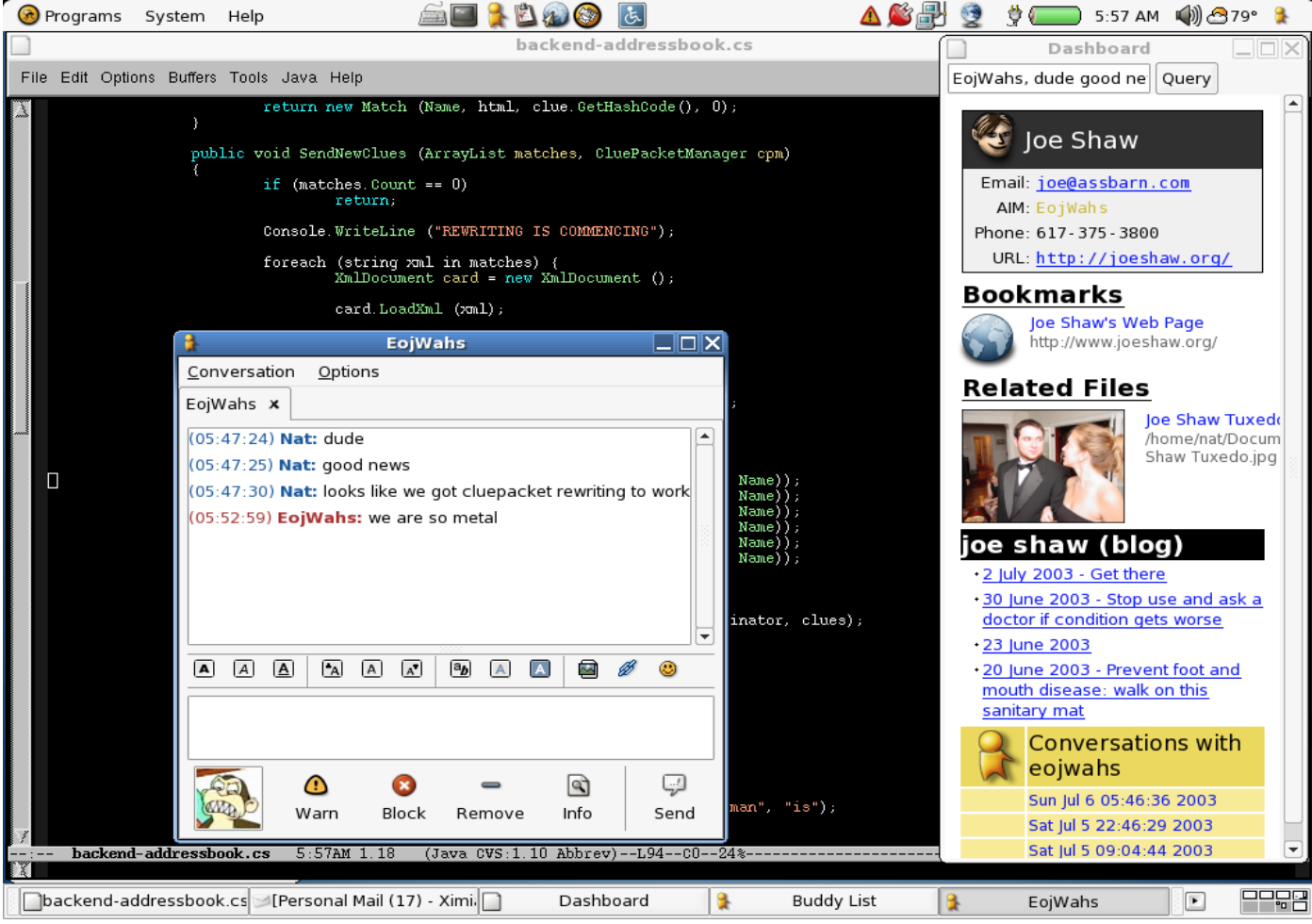 byI keep thinking about old projects in the Gnome2 days, when I used desktop Linux and how much fun desktop computing used to be. Everything was open β either by choice via open standards or by force e.g. reverse engineering messenger clients, which then allowed the data to be local and open. You to do cool things like Beagle (and really Nat's Dashboard app before that).