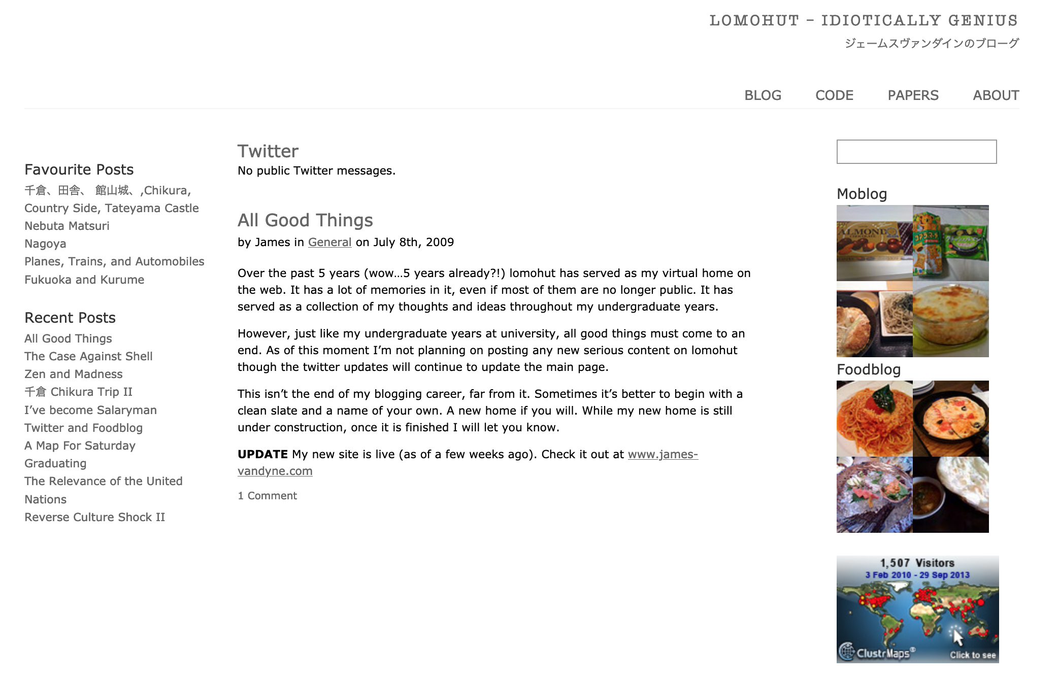 My second blog I kept for around 5 years. It mostly chronicled my college life and my year studying abroad in Tokyo in 2007 - 2008. If I recall correctly, my "Moblog" was powered by sending emails from my Japanese-flip phone to Flickr.I miss this old site. I wonder if I have the data anywhere.