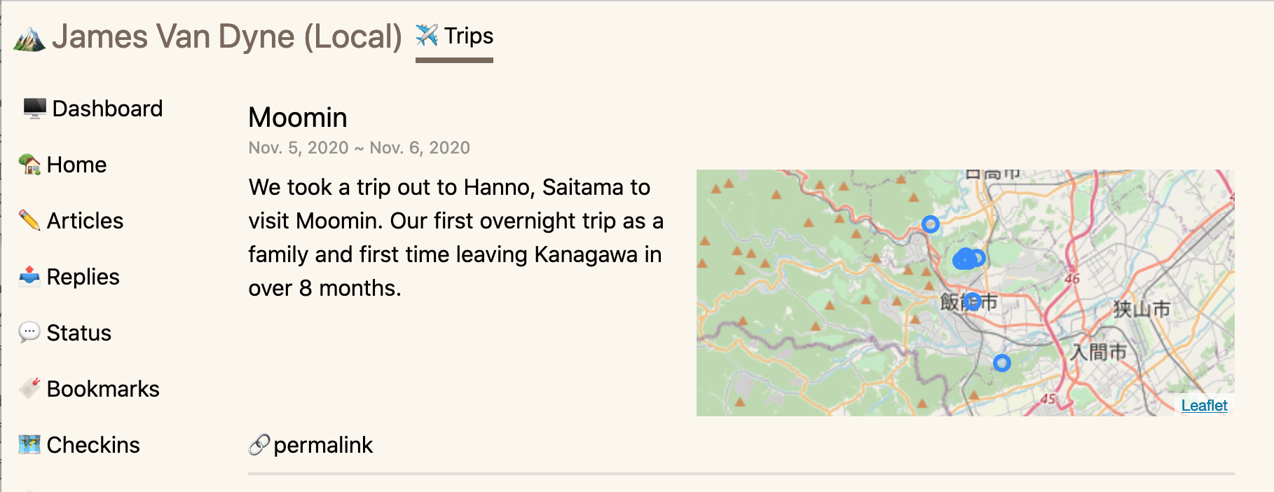 This site is powered by Tanzawa, an open source blogging engine I started building about a year ago. Tanzawa is built with Python/Django with a splashes of Javascript (Stimulus) for the maps. Mapping is powered by Leaflet.js. -